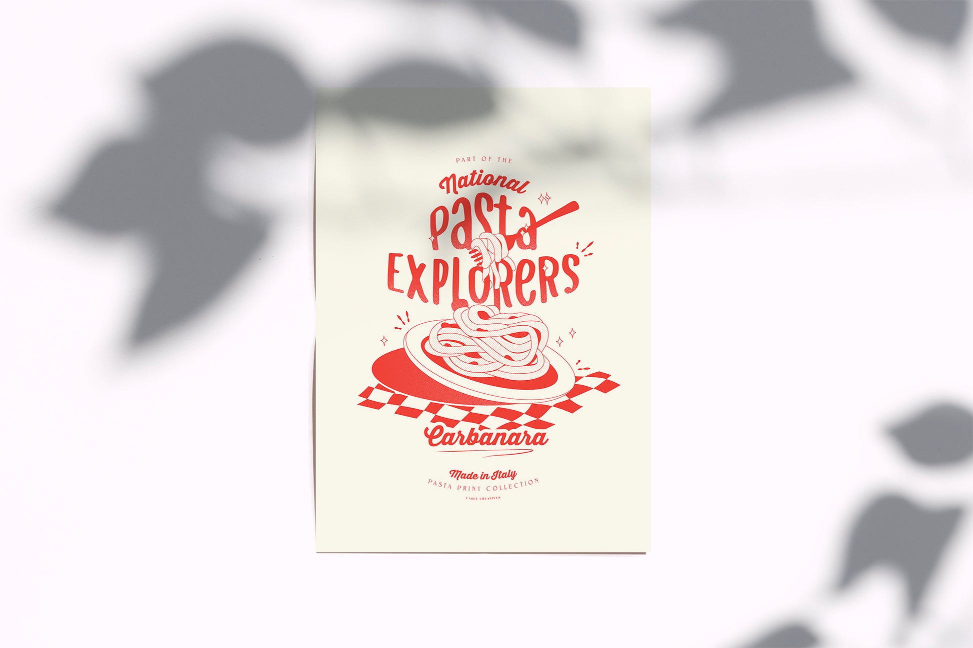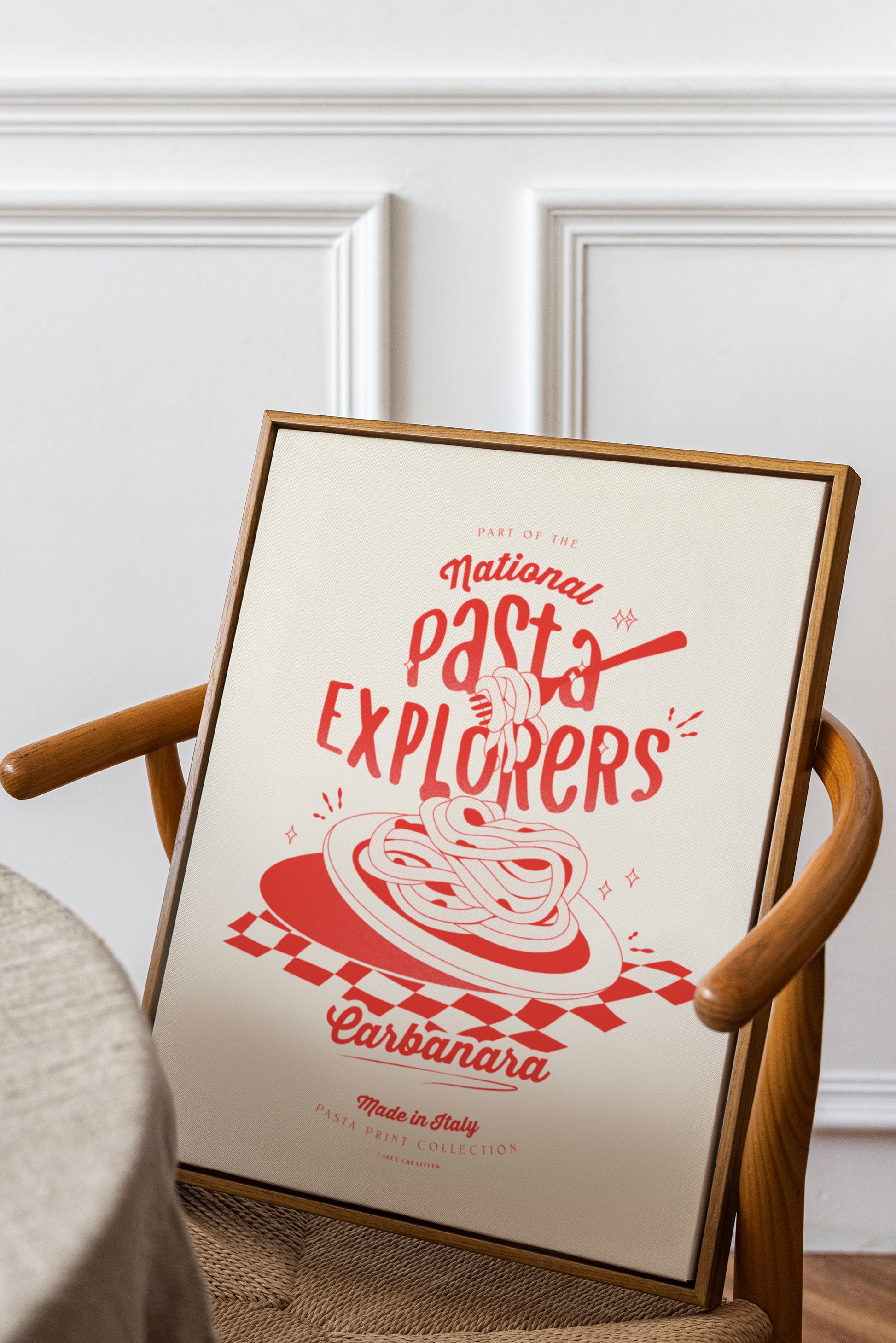 Carbonara Pasta Poster inspired by your favorite type of pasta! National Pasta Explorers Retro design with illustrated pasta design and quote. Illustrated print showcases your favorite italian dish. Modern, textured art style that would look great on the walls of any room. Enthusiast Collections' goal is to make interiors magical, unique, and wonderful with art print posters!